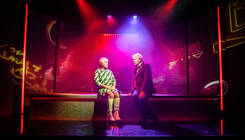 Set design was also by Banks and it was clear that every detail was meticulously considered from the materials used to depict the “slinkiness of Soho” to structural decisions allowing gaps to be used as portals from the past to the future. At times, the set somewhat hindered the fluidity of the production, and it was jarring to see a stagehand conspicuously switching props through the translucent gauze of the already clunky sliding set-pieces. Furthermore, the use of these doors during scene transitions, which although were effective during quick changes or character hopping, stilted the naturally chaotic narrative by fractionally over-staying their welcome. However, vintage video design (by Sam Diaz) fully utilised the performance space and, along with sound by Ben and Max Ringham, triggered life-reference with both original music and iconic songs of the past five decades.