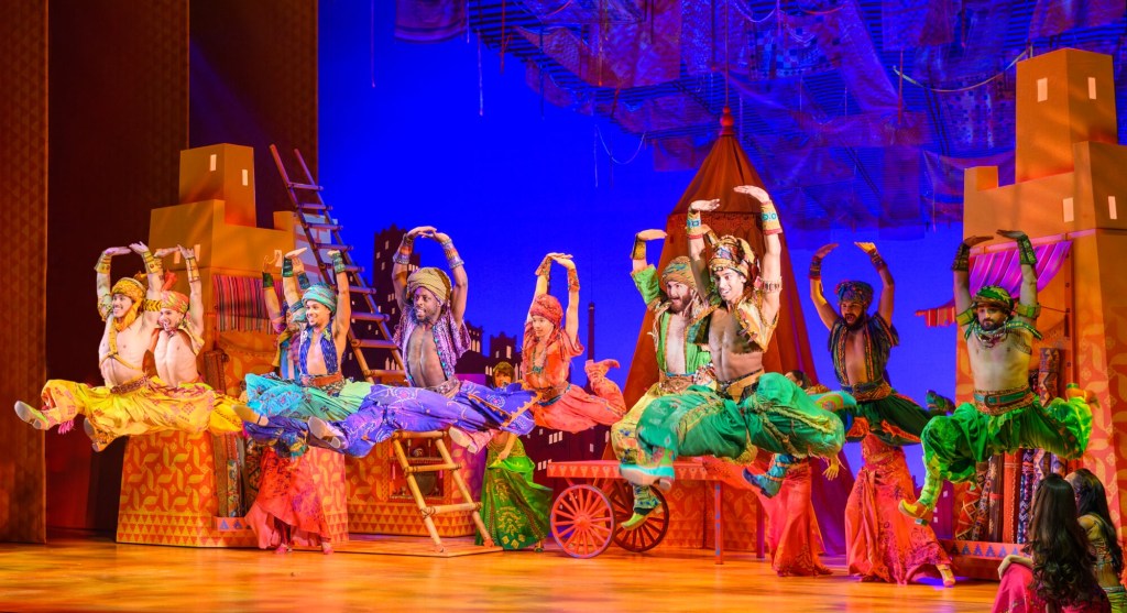 Speaking of walls, in a world where classic musicals have heavily become screen-centric (see the most recent Beauty and the Beast tour), vibrant Scenic Design (by Bob Crowley) transports the audience to a blistering Agrabah. Immediately capturing its essence, it immerses the audience with stunning visuals- complimented beautifully by Natasha Katz’s Lighting Design, which hits the glitter in all the right places. A particular stand out being in the Cave of Wonders which led to audible gasps amongst the audience. Adding to this is sumptuously colourful Costume Design (Greg Barnes), which is some of the most breath-taking I have seen on stage with every detail brought to life by Casey Nicholaw’s slick and punchy choreography.
