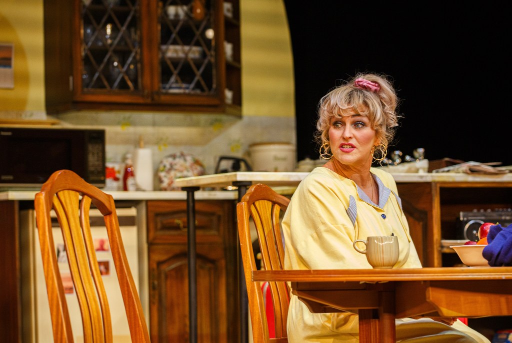 From the moment the lights come up on Katie Scott’s perfectly realised 1980s fitted kitchen, the audience is drawn into Shirley’s world. The set is sublime—repetitive and unchanging, much like her life, reinforcing the daily cycle she longs to break free from. Every detail feels deliberate, from the everyday essentials to the flickering kitchen light, seemingly symbolising the motions she goes through on a daily basis. This carefully constructed environment makes her eventual escape to a world bathed in golden sunshine all the more striking.