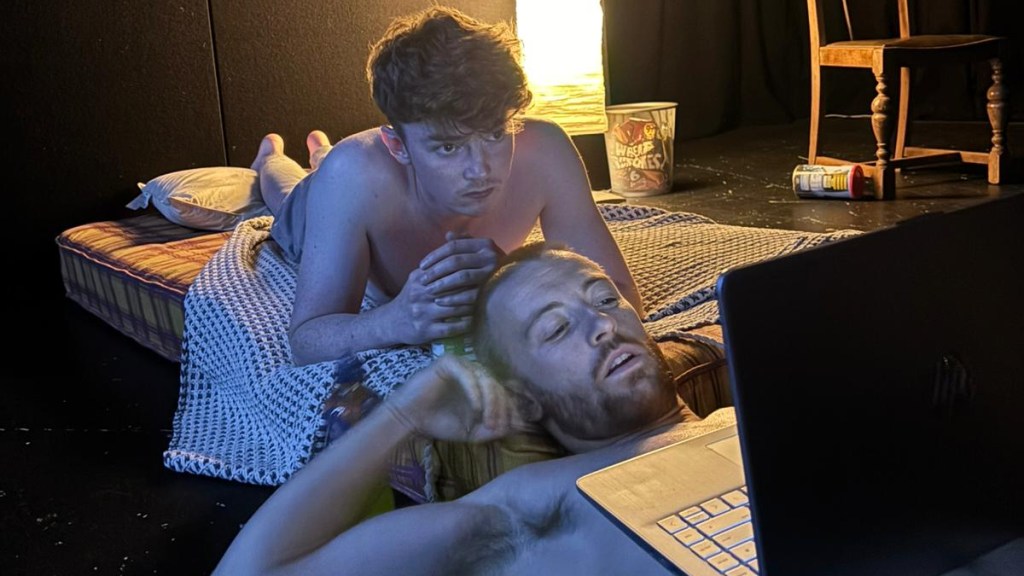 At the centre are two brothers, Hench (Adam Owers) and Bobbie (Jonny Grogan), left to fend for themselves in a council flat. They exist in a liminal state between boyhood and adulthood, both feral and vulnerable. Owers’ Hench is remarkable; he conveys trauma through the smallest shifts of breath and gaze, his micro-acting charting a boy teetering on collapse. Grogan’s Bobbie is all erratic energy, ricocheting between bravado and neediness. Together, they embody co-dependency in its rawest form: bonded by love, but suffocated by it, too.