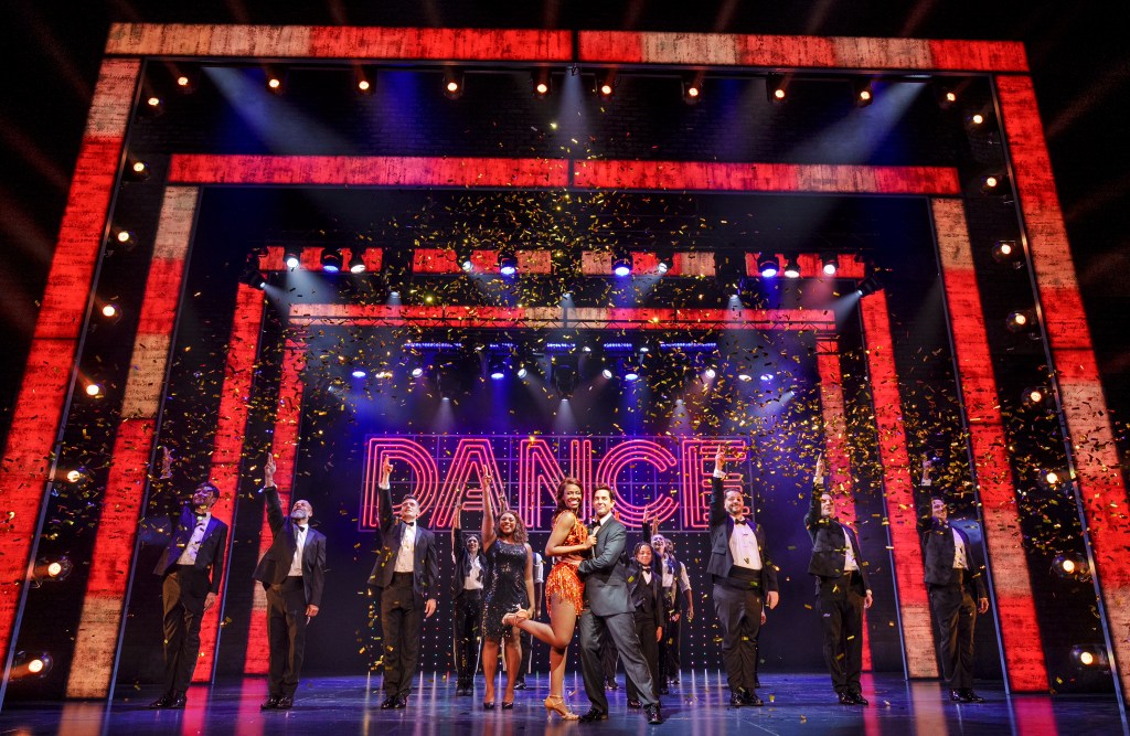 Karen Bruce’s choreography is predominantly performed with gusto by the dynamic ensemble, full of passion and jaw-dropping lifts that create a visual feast, which is bolstered by Mark Henderson’s versatile and atmospheric lighting design. Video design by Duncan McLean adds a cinematic dimension to the production, but, like Tim Hatley’s design, doesn’t always quite hit. McLean’s video requires concise direction, which is not always present, and in one scene comes across as beyond cliché and feels more Marvel than romantic. Likewise, Hatley’s set is minimal but purposeful, though a lack of precision occasionally sees curtains concealing cast members before scenes have fully resolved. Where design doesn’t quite hit is with the costumes; I can’t forgive the choice to have a global superstar wear high-tops and jeggings to a promotional event, especially given the direct comparison to the iconic outfit from the film. Where is the glamour?!