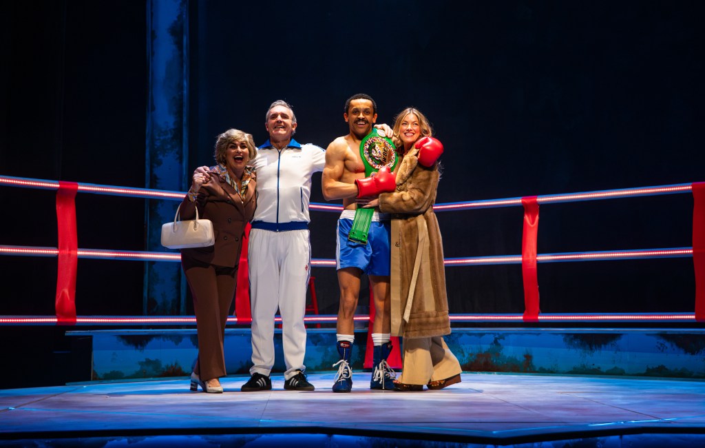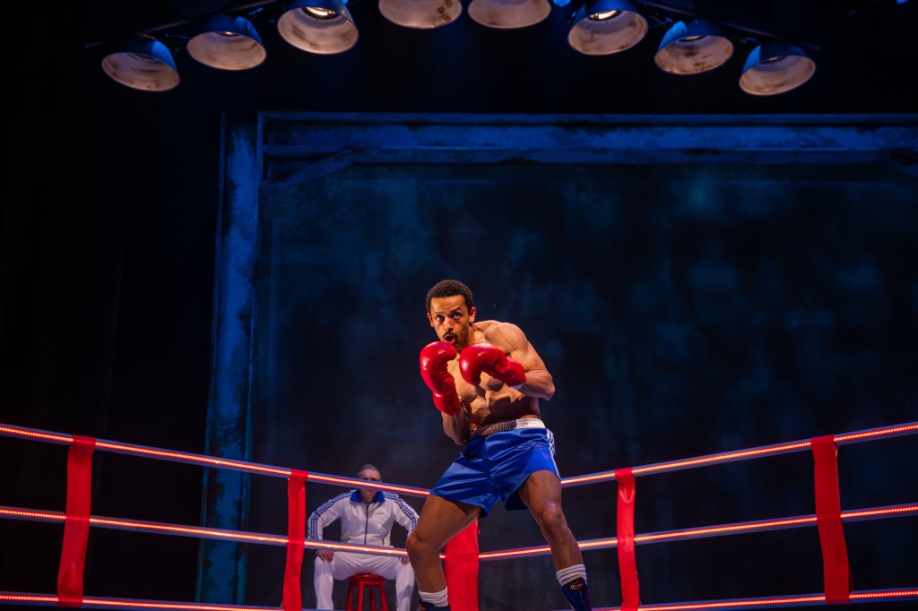Directed by Mark Womack, Julius gives a charismatic and charming portrayal of Conteh, and, with support from a superb cast and eye-catching design choices, gives for a well-rounded production, albeit occasionally safe. Helen Carter, as usual, gives a finessed performance as Joan and has faultless chemistry with on-stage husband Mark Moraghan as George, Conteh’s rigorous and committed trainer. Zach Levene multiroles as Conteh’s brother but steals the show as Don King and brings hilarity and flamboyancy to the American boxing promoter. Amber Blease, in her Royal Court debut, grounds the production and brings an air of naturalism that is refreshing in comparison to the other characters on stage.
